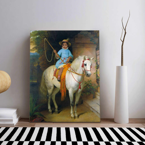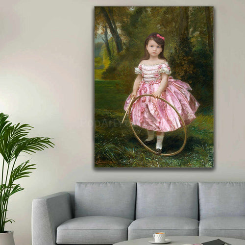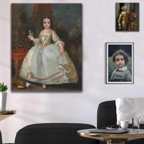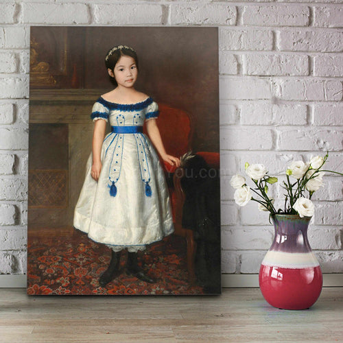 A girl in a blue and white dress in front of a fireplace personalized portrait
