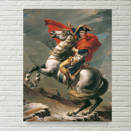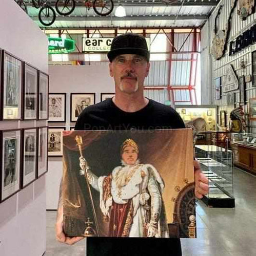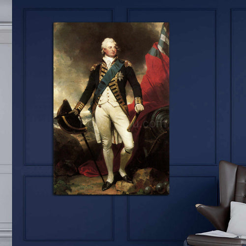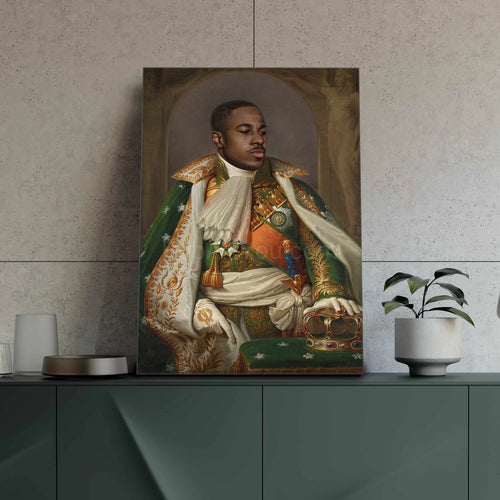A portrait of a man standing on the beach dressed in regal attire stands on a table against a blue wall