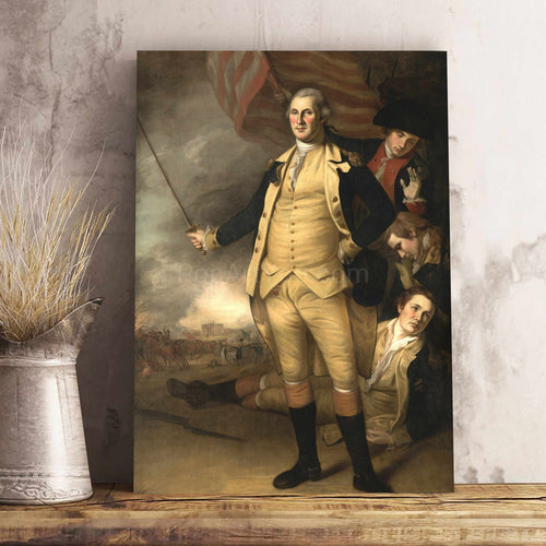 A man holding a portrait of himself, dressed in a historical costume of a general-diplomat