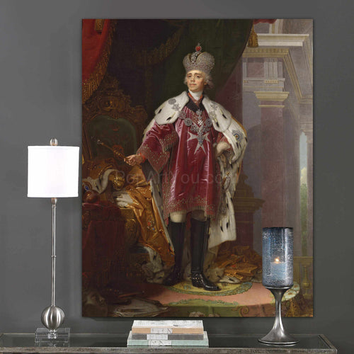 On the table against the background of a gray wall is a portrait of a man dressed in a royal costume