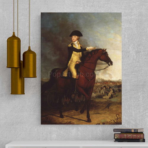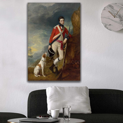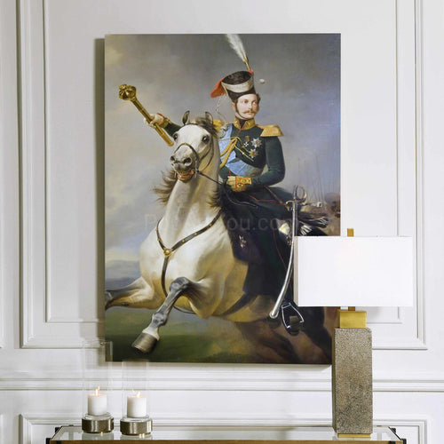 On the white wall next to the clock hangs a portrait of a man dressed in historical officer's clothing