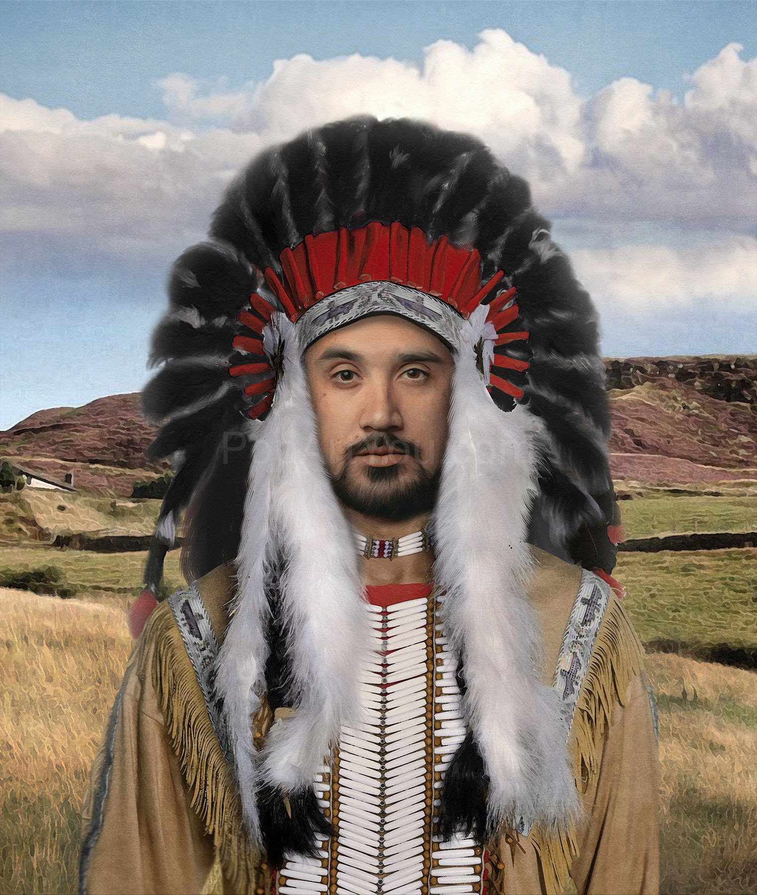 • Load image into Gallery viewer, The portrait shows a man dressed in the attire of an American Indian