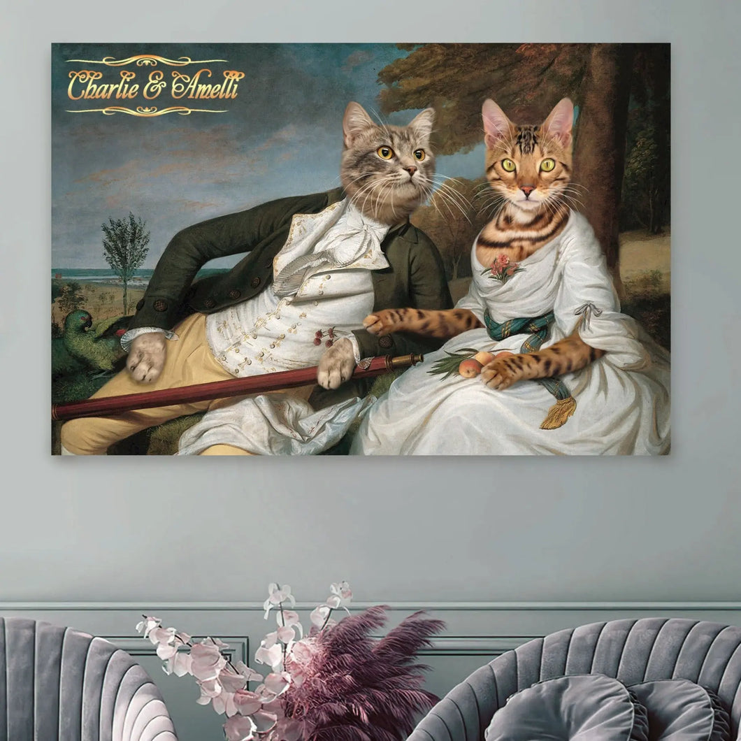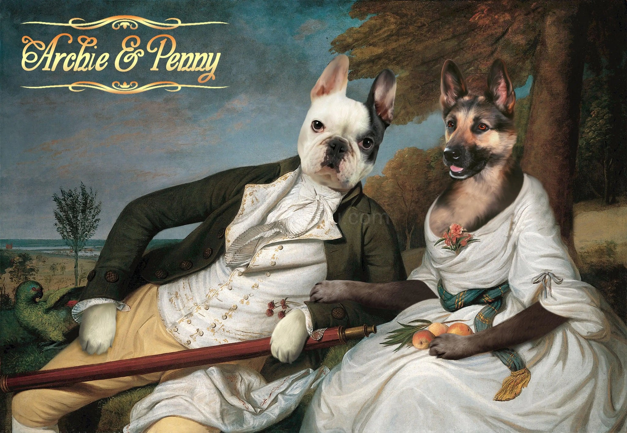 The portrait shows a couple of two dogs with human bodies dressed in white royal clothes