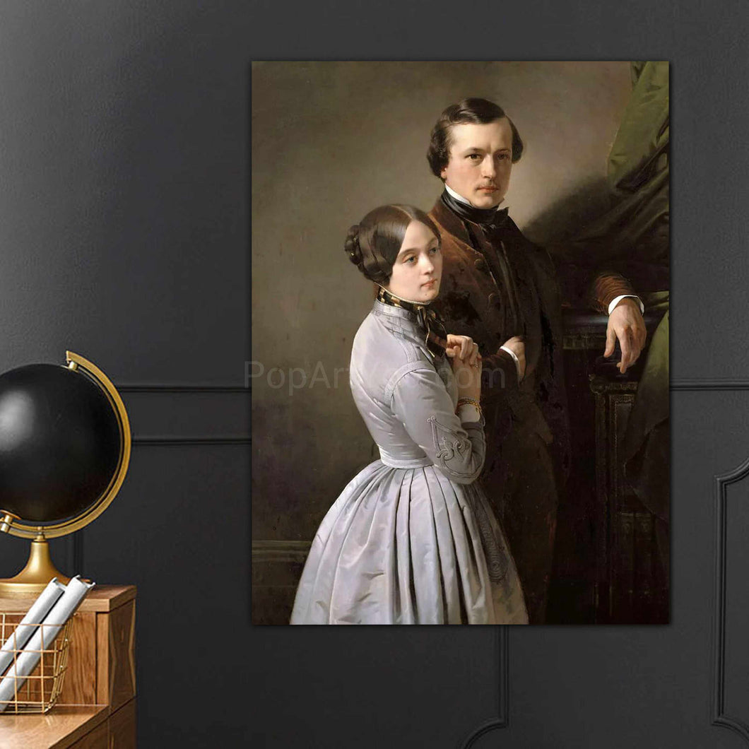 • Load image into Gallery viewer, Portrait of a couple dressed in historical royal clothes hangs on a black wall near a black globe