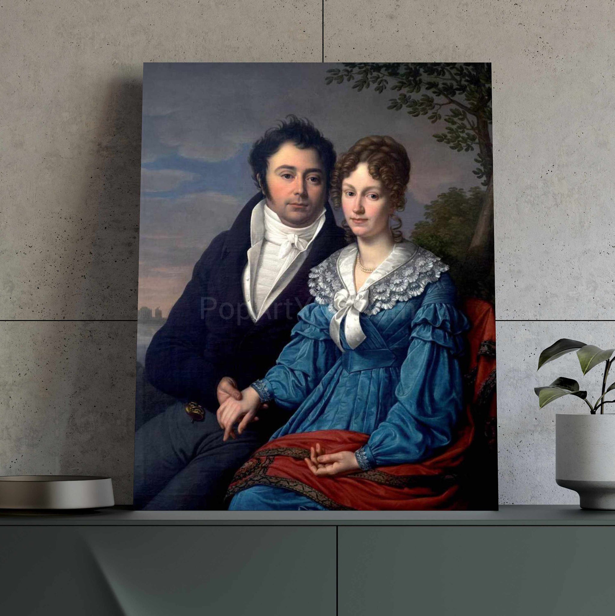 • Load image into Gallery viewer, Portrait of a couple dressed in blue royal clothes standing on a white sofa