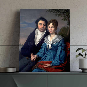 • Load image into Gallery viewer, Portrait of a couple dressed in blue royal attires stands on a green table near a flowerpot