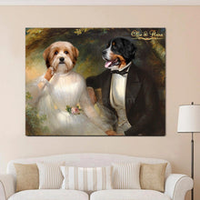 • Load image into Gallery viewer, Portrait of a couple of two dogs with human bodies dressed in white and black regal attires hanging on a gray brick wall above the sofa