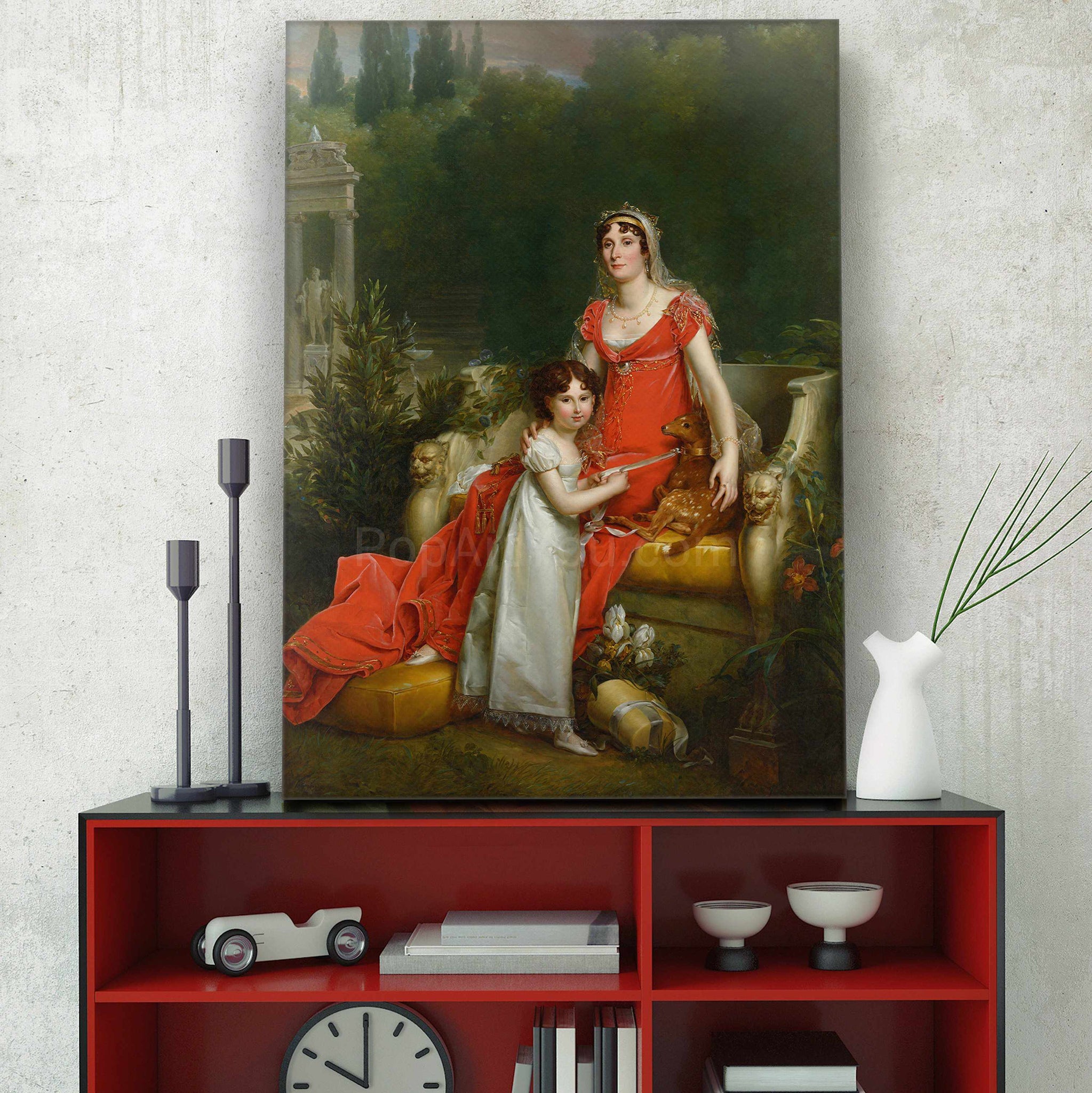 Portrait of a woman dressed in a red royal dress and a girl dressed in a white royal dress stands on a black table near the clock