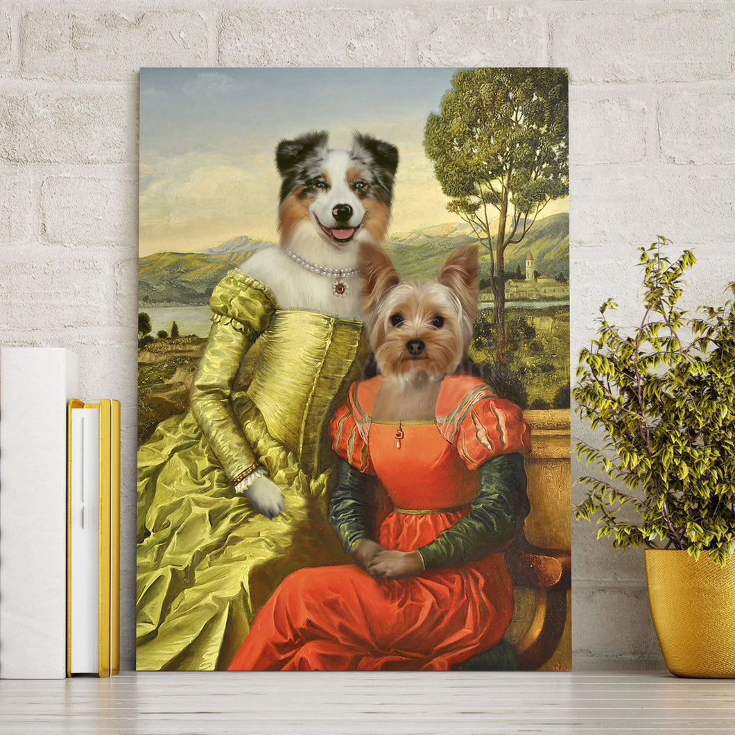 • Load image into Gallery viewer, Portrait of two female friends dogs with human bodies dressed in historical royal dresses stands on a wooden table near books