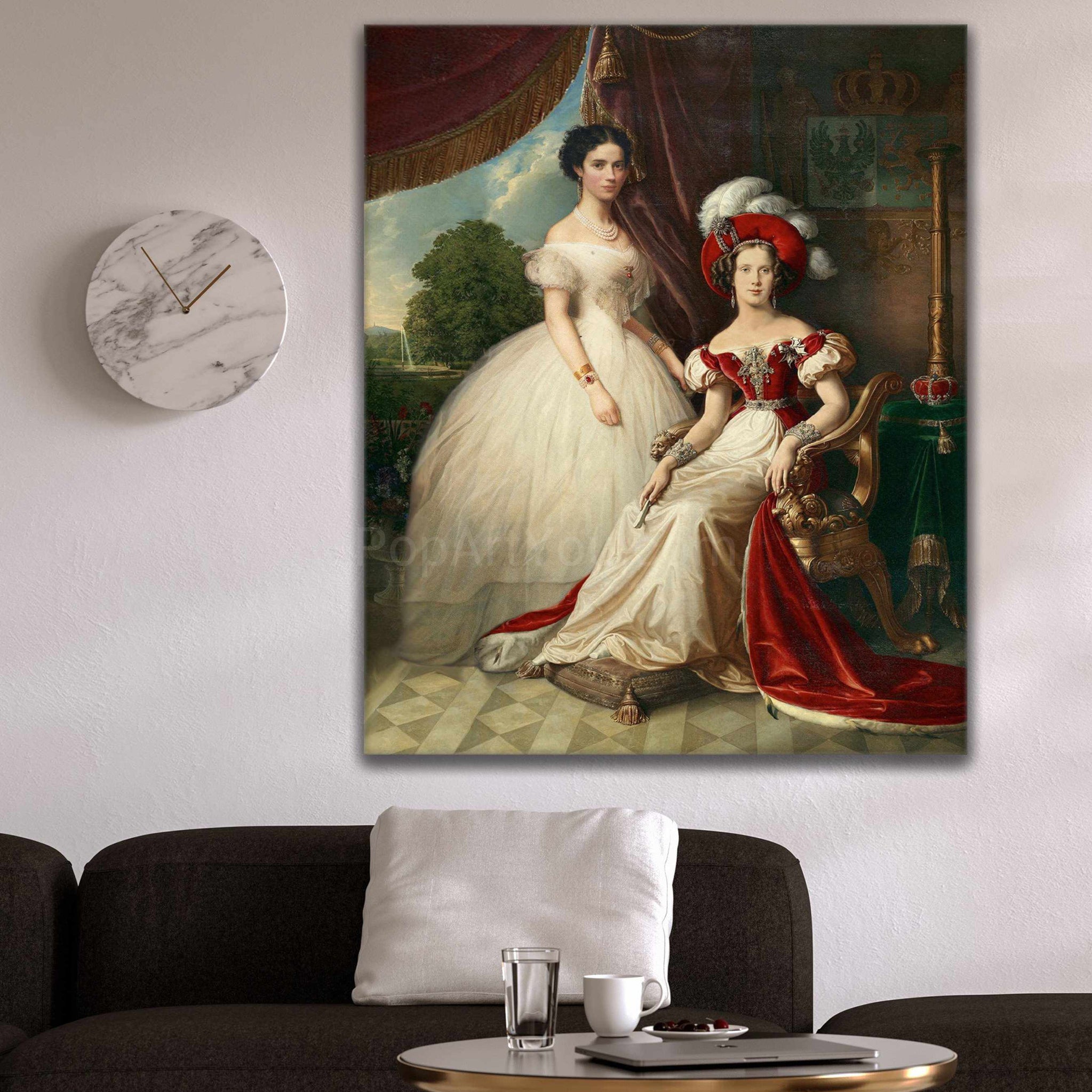 • Load image into Gallery viewer, Portrait of two women dressed in historical royal clothes hangs on a white wall near the clock above the sofa