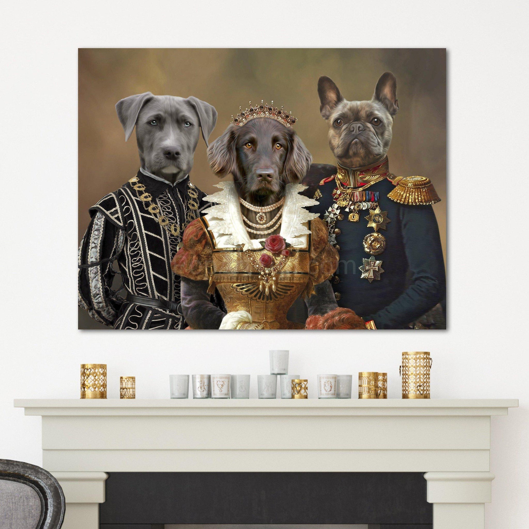 • Load image into Gallery viewer, Portrait of three dogs with human bodies dressed in historical royal clothes hangs on the white wall above the fireplace
