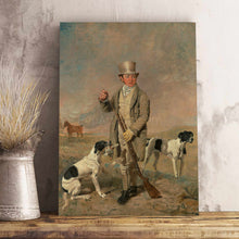 • Load image into Gallery viewer, A portrait of a man standing next to two dogs dressed in historical royal clothes stands on a wooden table