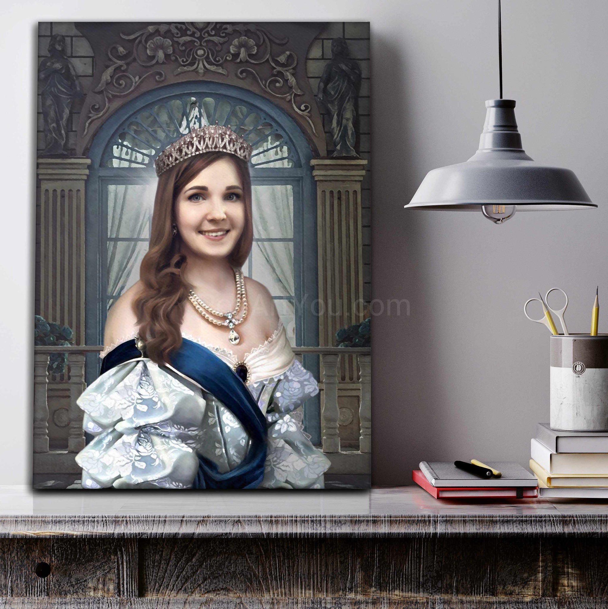 A portrait of a woman dressed in the royal clothes of a Princess stands on a gray wooden table