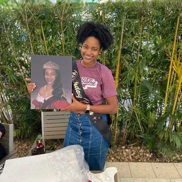 A girl holding a portrait of herself dressed in a royal Princess attire