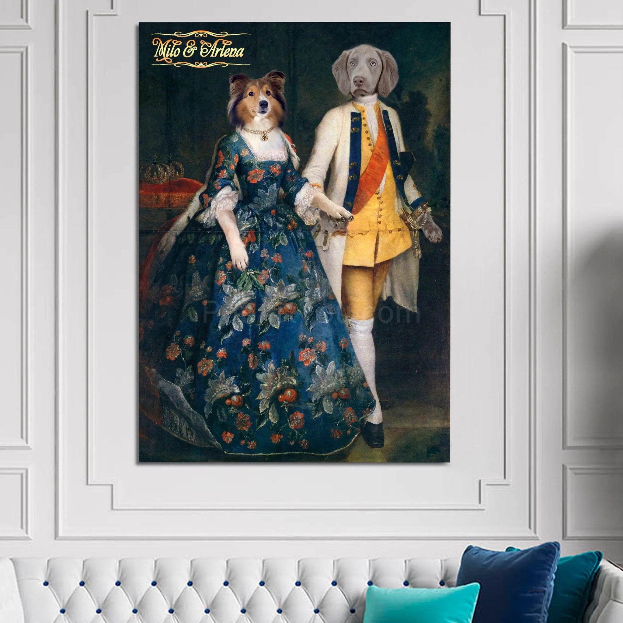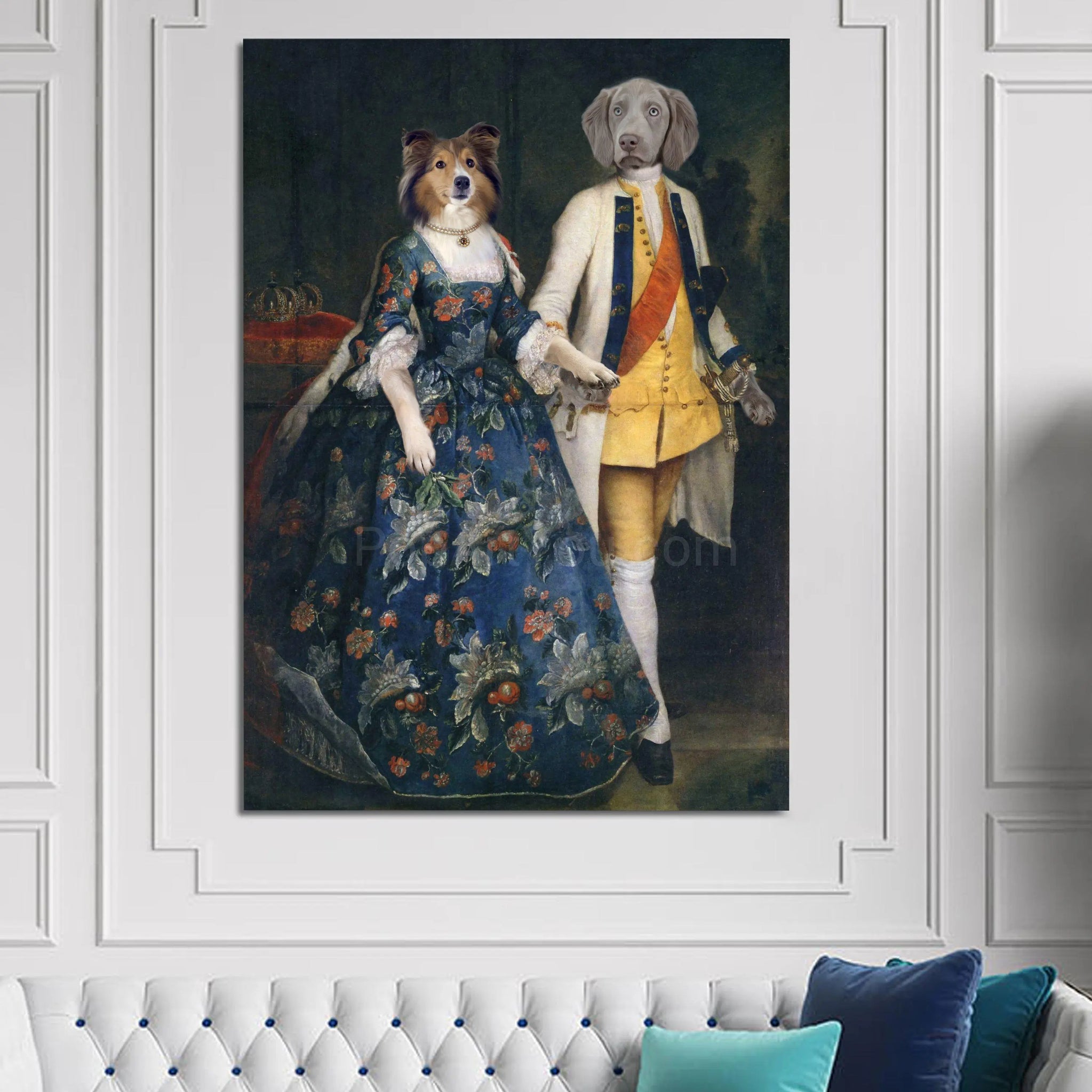 Portrait of a pair of two dogs with human bodies dressed in blue regal attires hanging on a white wall above the sofa