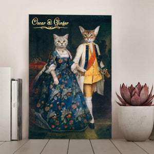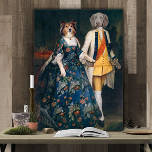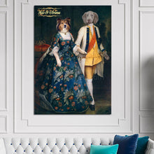 • Load image into Gallery viewer, Portrait of a pair of two dogs with human bodies dressed in blue regal attires hanging on a white wall above the sofa