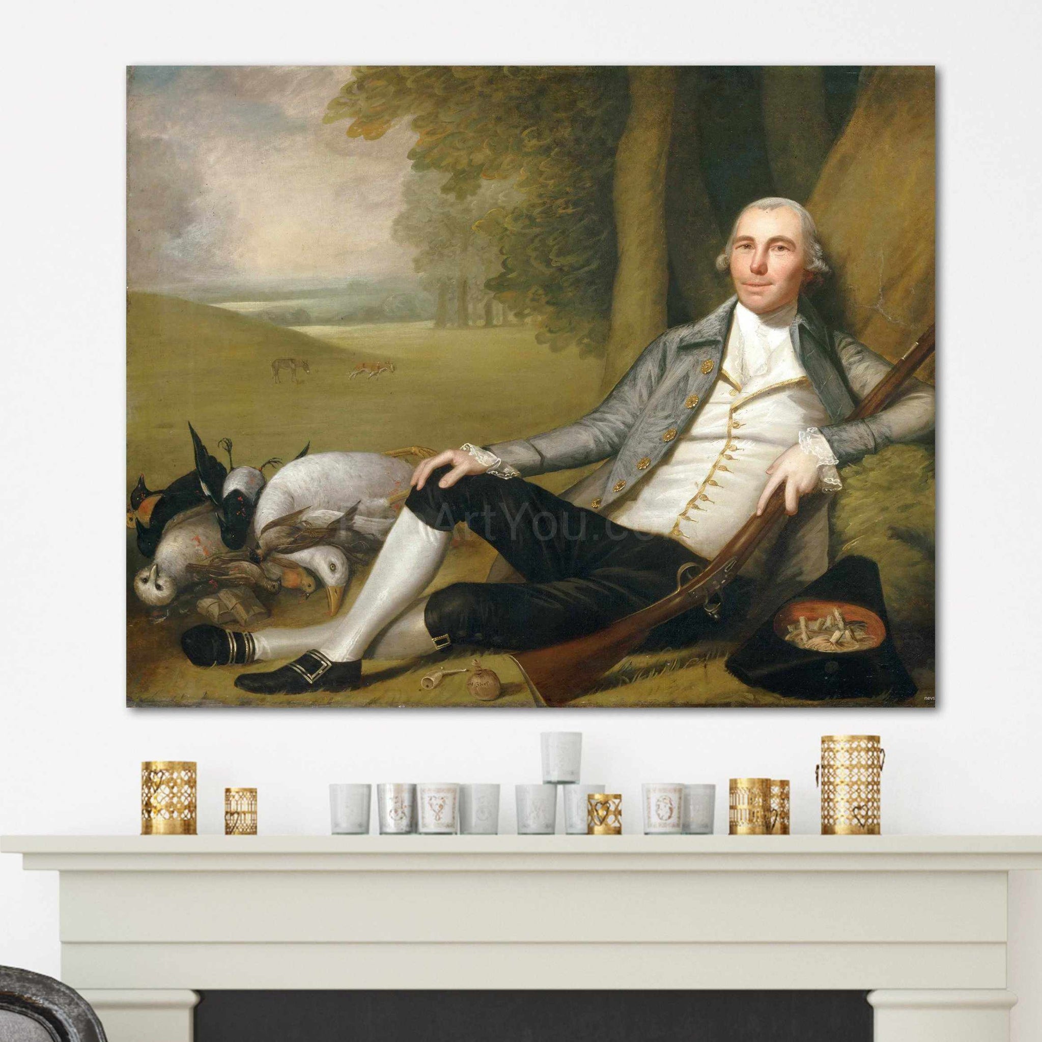 • Load image into Gallery viewer, A portrait of a man after a hunt dressed in renaissance regal attire hangs on a white wall
