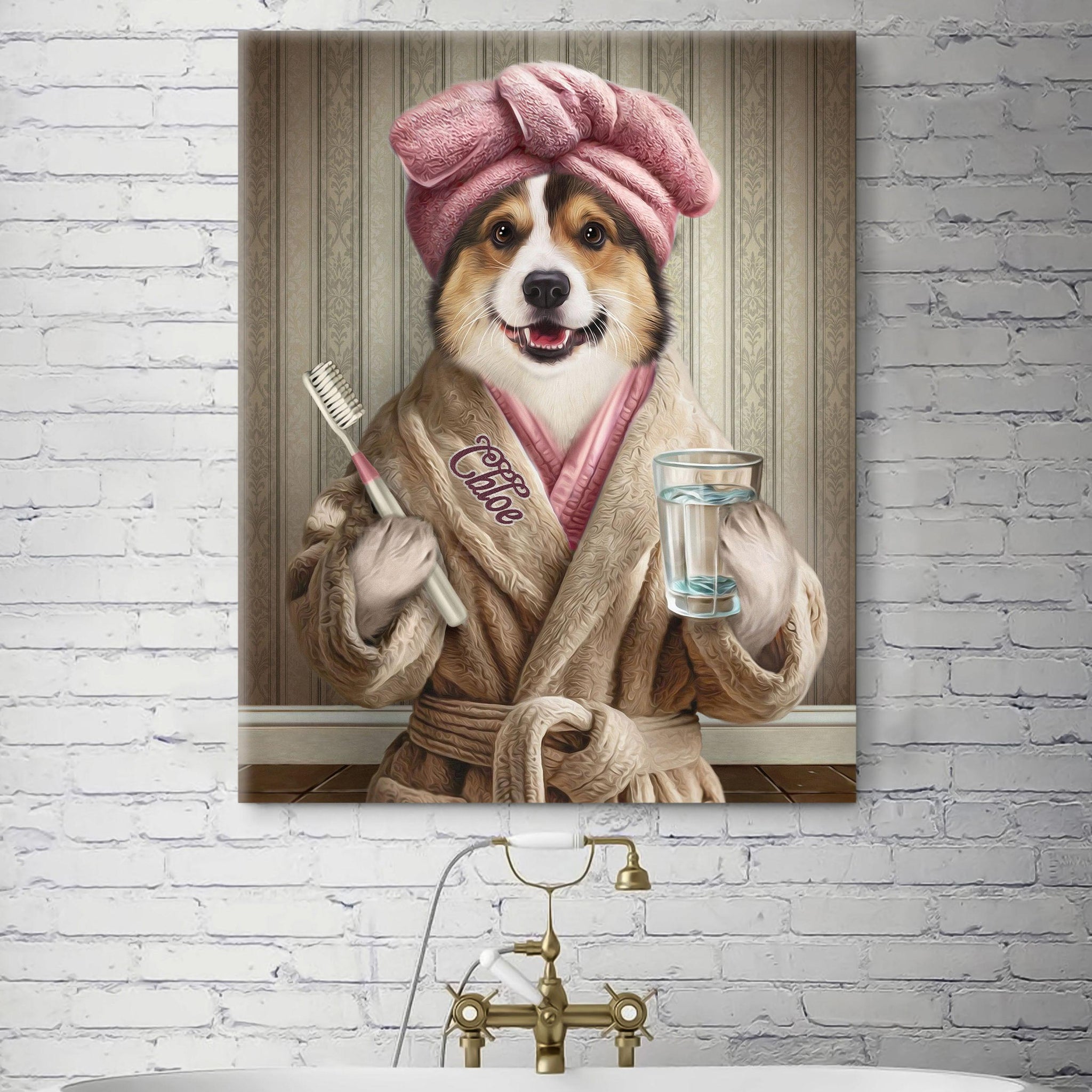 We offer custom-made spa animal bathroom prints from your photos. We transform pet photos into dog bathroom decor - portraits of pets in a robe. Our pets art captures your pet’s personality in the most creative sense. Bathroom portraits are a truly unique gift that is a joy to give as well as receive.