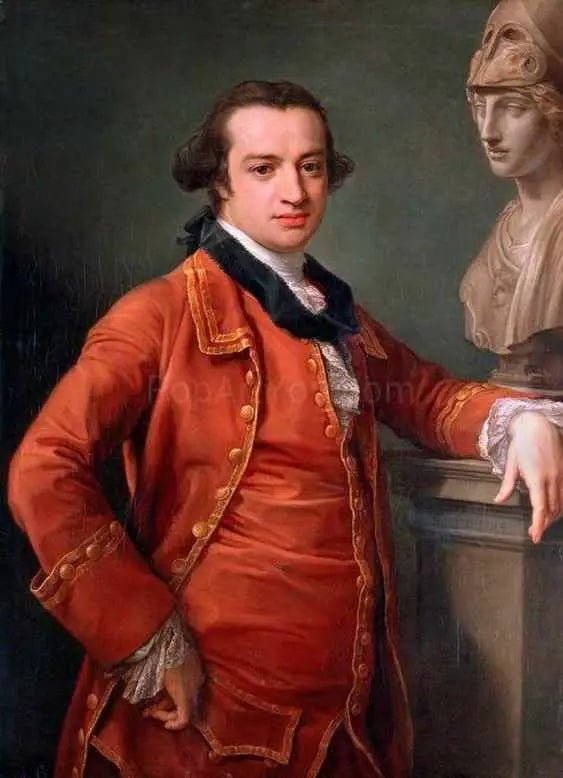 The portrait shows a man near the sculpture, wearing a red historical costume