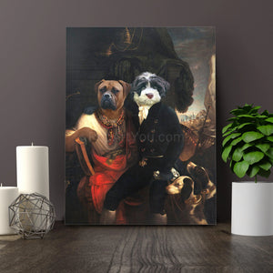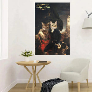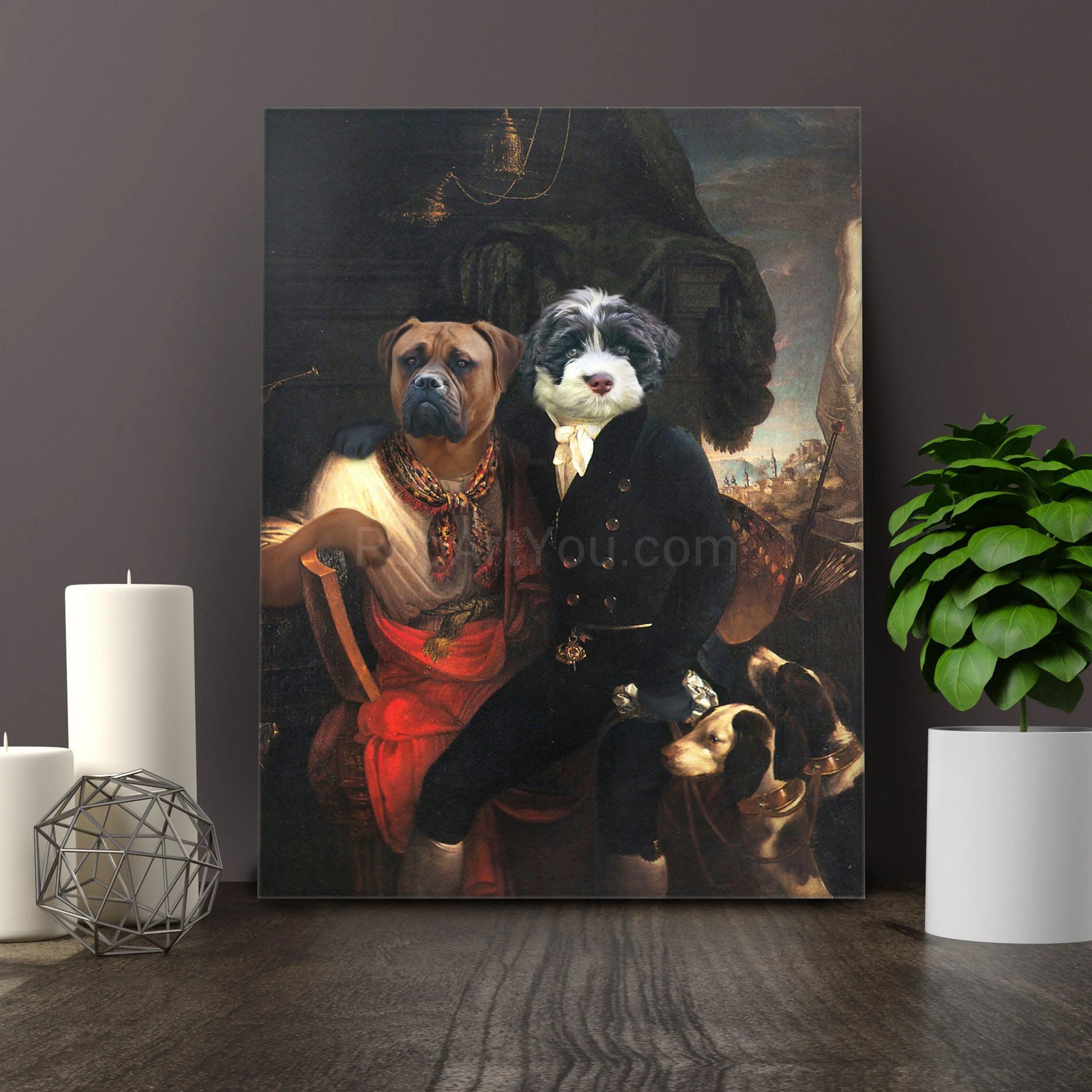 • Load image into Gallery viewer, Portrait of two brothers dogs with human bodies dressed in historical regal attires hanging on a white brick wall